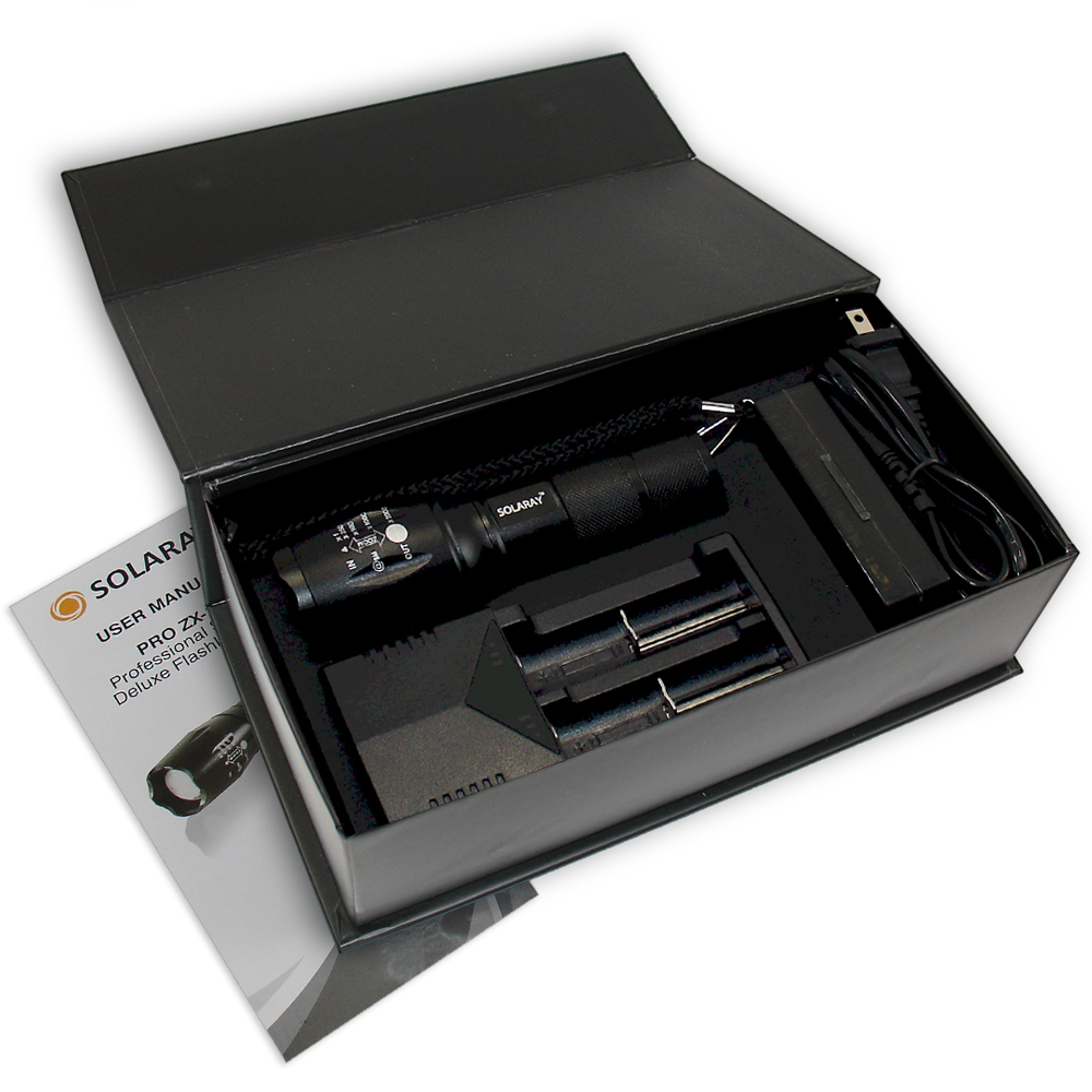 1 x ZX-1 LED Flashlight 1 x Attached Lanyard 1 x Rapid Battery Charger 1 x AAA Battery Holder 2 x Rechargeable Batteries 1 x Storage Case for Batteries 1 x User Manual